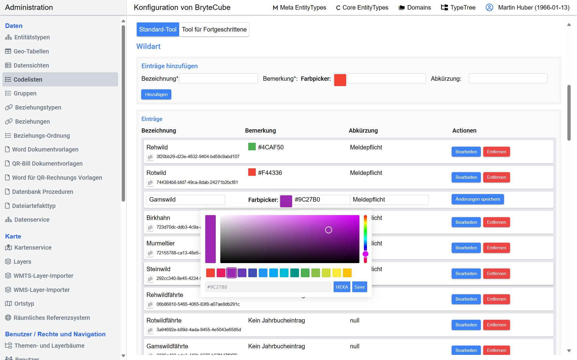 Codelisten sind systemweit einsetzbar mit universellen Schlüsseln und Farbcodierung.