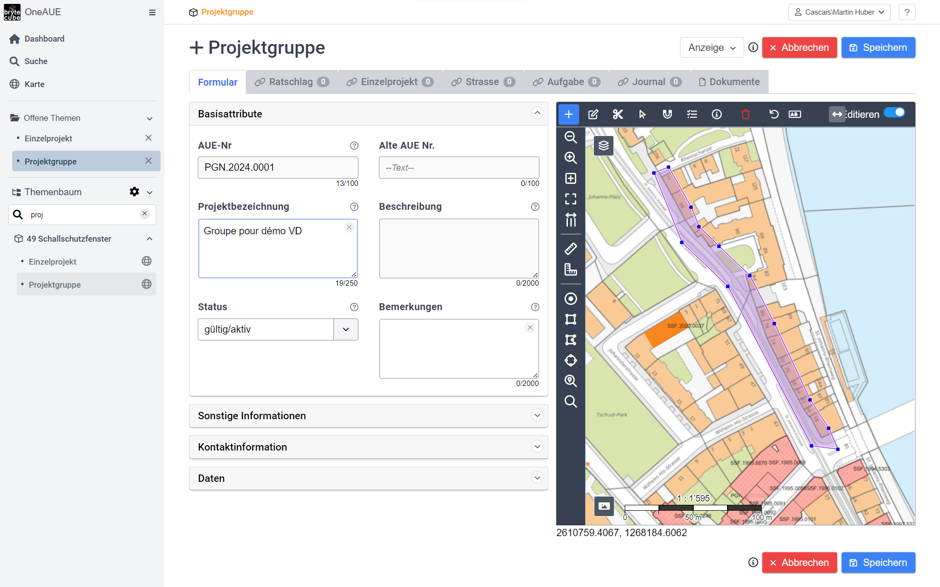 Jedes Objekt in BryteCube kann mit einer oder mehreren Geometrien im geografischen Raum verortet werden. Geodaten werden mit minimalem Aufwand direkt im Web-Browser editiert. Beliebige Kartenlayer wie z.B. die Vermessungsdaten können für Snap-Funktionen verwendet werden. So entstehen eigene Geodaten präzise und passgenau.