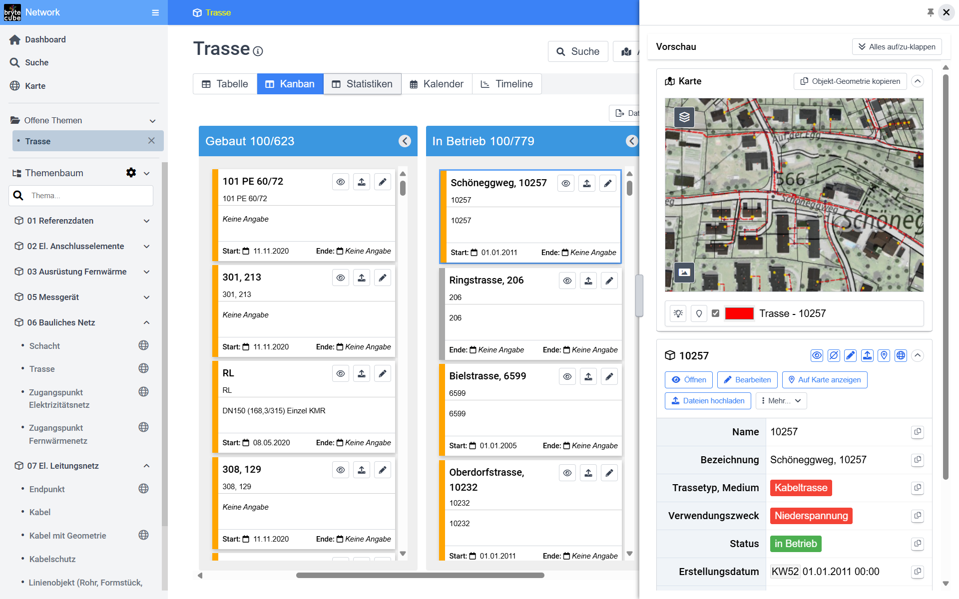 Wählen Sie aus Fachdatenmodellen für Elektrizitäts-, Fernwärme-, Glasfaser-, Kanalisations- und Entwässerungs-Netze usw. Ihre aus und passen Sie diese an die Bedürfnisse Ihres Werkes an. Die Projekt-, Betriebs- und Instandhaltungs-Module von BryteCube sorgen für eine einheitliche Vorgehensweise in Ihrer gesamten Organisation und ermöglichen es Ihnen, ressourcensparende und nachhaltige Koordinations- und Lifecycle-Management-Prozesse einzuführen. Effiziente Datenmigrations- und -synchronisierungsprozesse helfen Ihnen zudem, die bestehenden Daten rasch und qualitätsgesichert auf Ihre BryteCube-Datenplattform zu bringen.