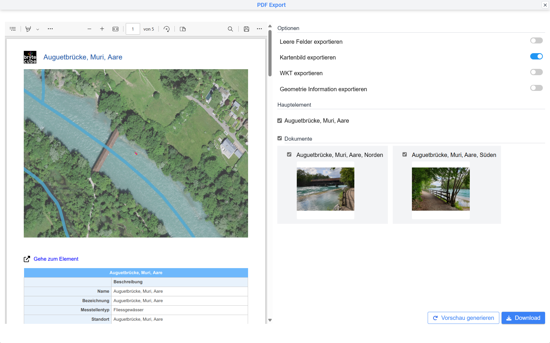 BryteCube generiert Dokumente, Kartenextrakte, Excel-Dateien für alle möglichen Anwendungen. QR-Rechnungen für die Abrechnung oder Pivot-Tabellen für die statistische Analyse von Messdaten gehören ebenso zum Leistungsumfang wie hochauflösende Kartenausdrucke in beliebig grossen Formaten.